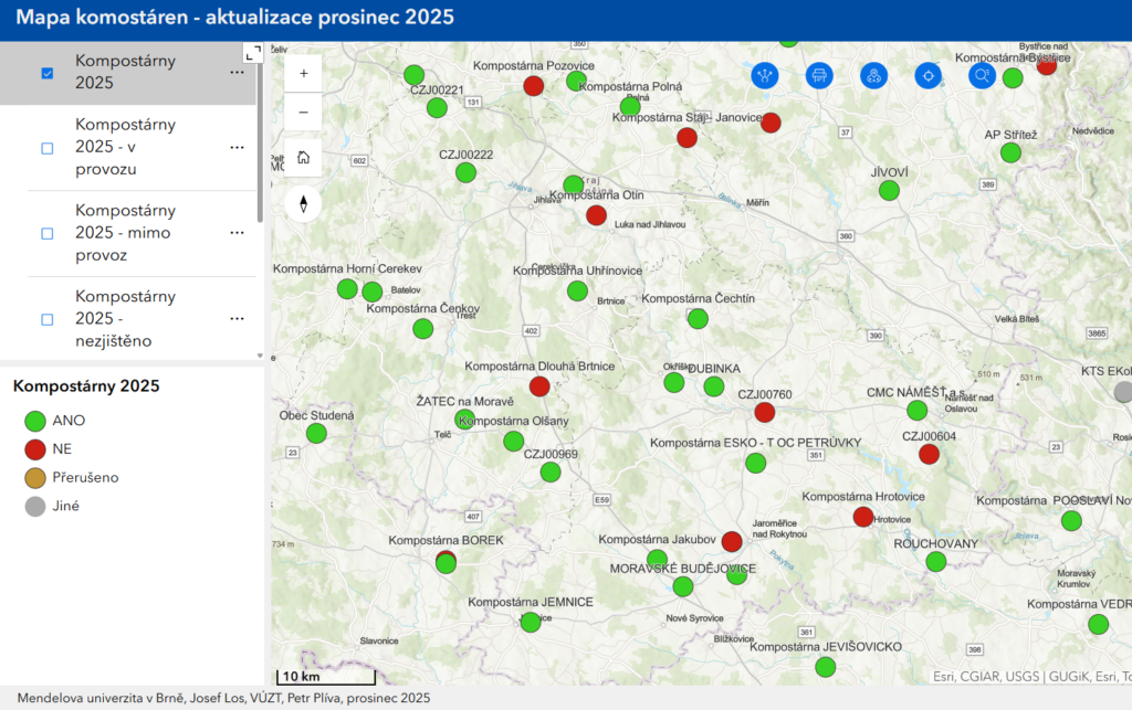 Mapy Mapa kompostáren v ČR aktualizace k 12 2025 aktualizace k 12/2024 aktualizace k 5/2024 aktualizace k 11/2023 aktualizace k 11/2022 Mapy jsou výsledkem řešení výzkumného projektu č. QK 1920177 – „Nástroje pro lepší využívání kompostovacích zařízení s následným navýšením vyrobeného kompostu, aplikovaného na zemědělskou půdu“